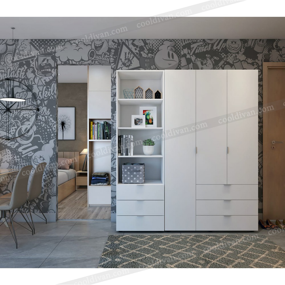 Пенал для книг та одягу DG-03 — універсальний та місткий елемент меблів, який стане стильним доповненням до сучасного інтер’єру. Завдяки продуманій конструкції пенал легко поєднується з іншими модулями, організовує простір і дозволяє зберігати речі максимально зручно. Модель має чотири відкриті полички для книг, декору чи побутових дрібниць, а також три глибокі шухляди, які чудово підходять для зберігання одягу або документів. Зручні ручки з матовим покриттям надають виробу естетичності та дозволяють користуватися шухлядами без зайвих зусиль.