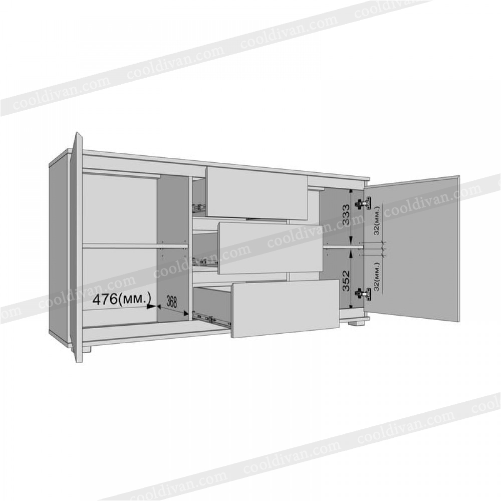 - Боковые отделы: Слева и справа расположены вместительные секции с дверцей, внутри каждой — полочка. Это отличное пространство для хранения объемных вещей, коробок или текстиля.