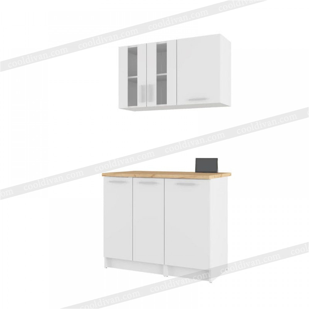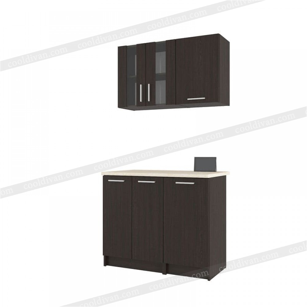 - верхний модуль: состоит из двух независимых отделов. Первый — двухдверный шкафчик с изящными вставками из стекла, что добавляет кухне легкости и позволяет красиво разместить сервиз или бокалы. Второй – однодверный отдел. Внутри обеих секций установлены полки для удобного зонирования