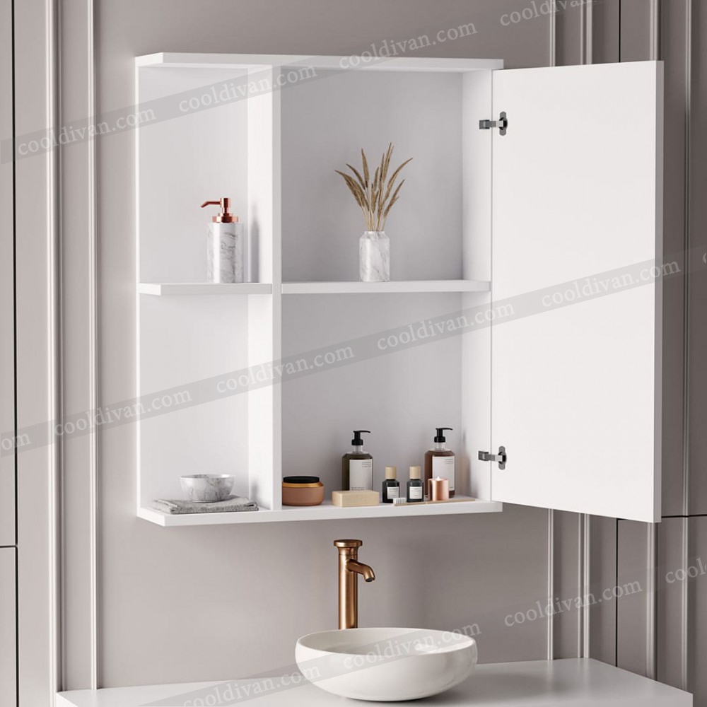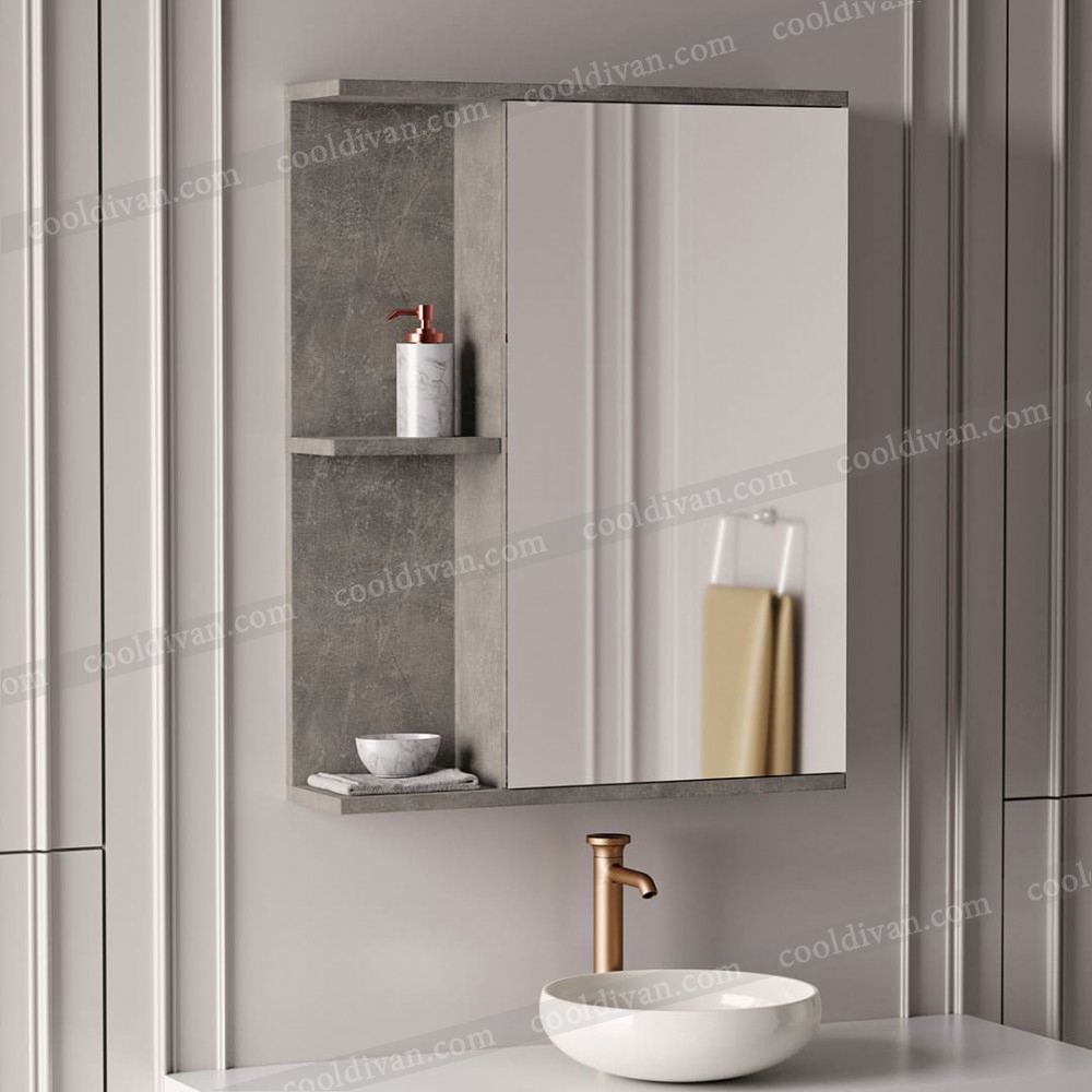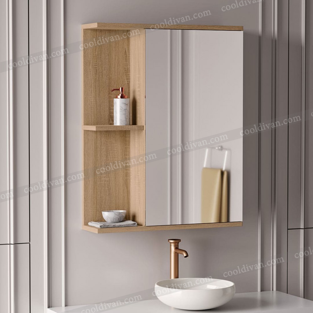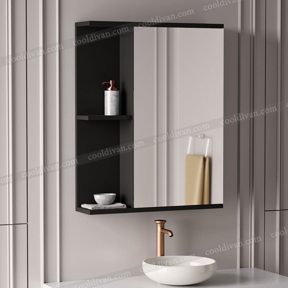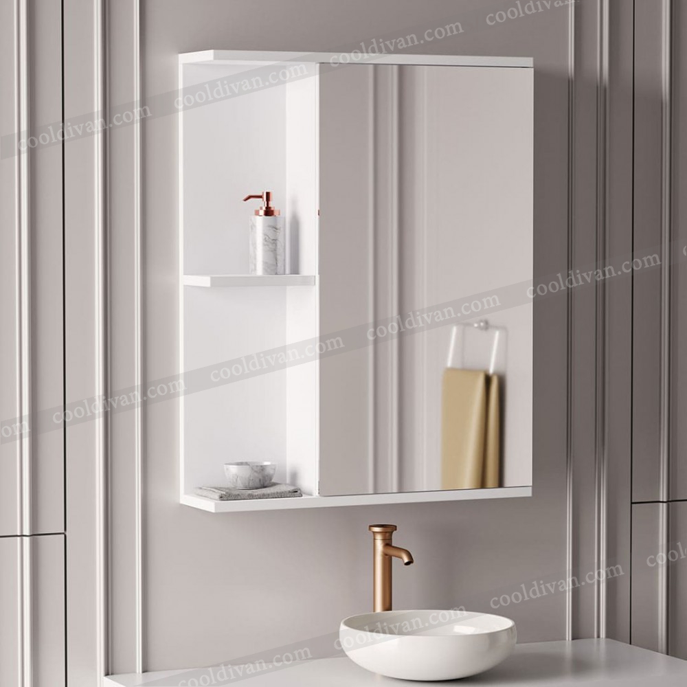 Эта модель разработана с учетом современных требований к комфорту. Она разделена на две функциональные зоны: Закрытая секция с зеркалом: Фасад шкафчика — это большое качественное зеркало, за которым скрыта внутренняя полочка. Здесь удобно хранить вещи, которые вы хотите скрыть от посторонних глаз или оградить от лишней влаги. Открытые боковые полки: слева от дверцы расположены две открытые ниши. Они идеально подходят для вещей ежедневного обихода, духов или стильных элементов декора, придающих ванной комнате уют.
