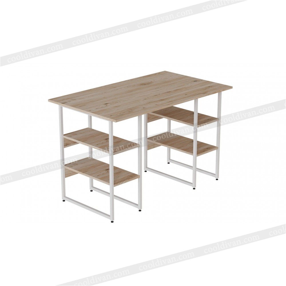 Металлические опоры покрыты матовой порошковой краской и доступны в трёх цветах — белый, чёрный, серый. Они обеспечивают отличную устойчивость и гармонично вписываются в стиль лофт. С обеих сторон расположены по две полки для хранения книг, документов, техники или декора. Ширина полок — 25 см, каждая выдерживает нагрузку до 20 кг, что делает конструкцию прочной и надёжной даже при интенсивном использовании.