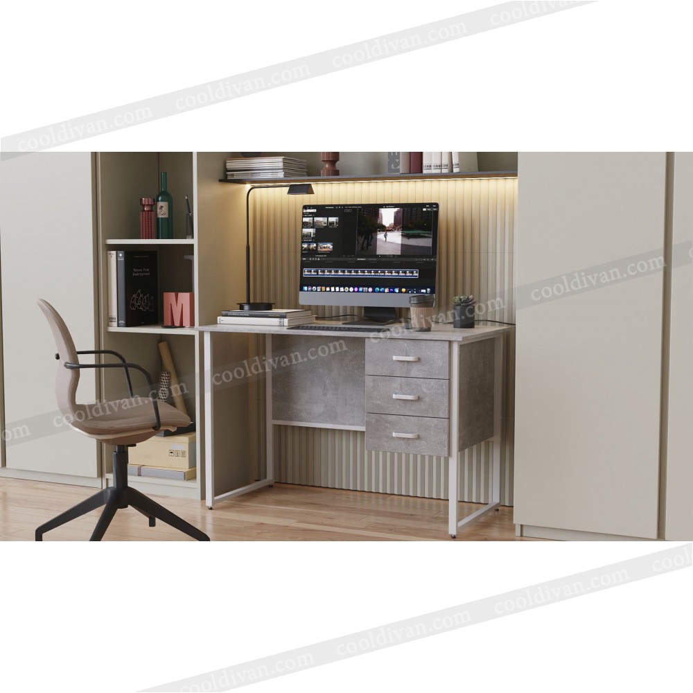 Металлические опоры в матовом исполнении (белый, черный, серый) обеспечивают устойчивость и надежность при ежедневной эксплуатации. Три выдвижных ящика оснащены телескопическими направляющими, которые гарантируют плавное и тихое открывание. Сторону расположения ящиков можно выбрать — справа или слева.
