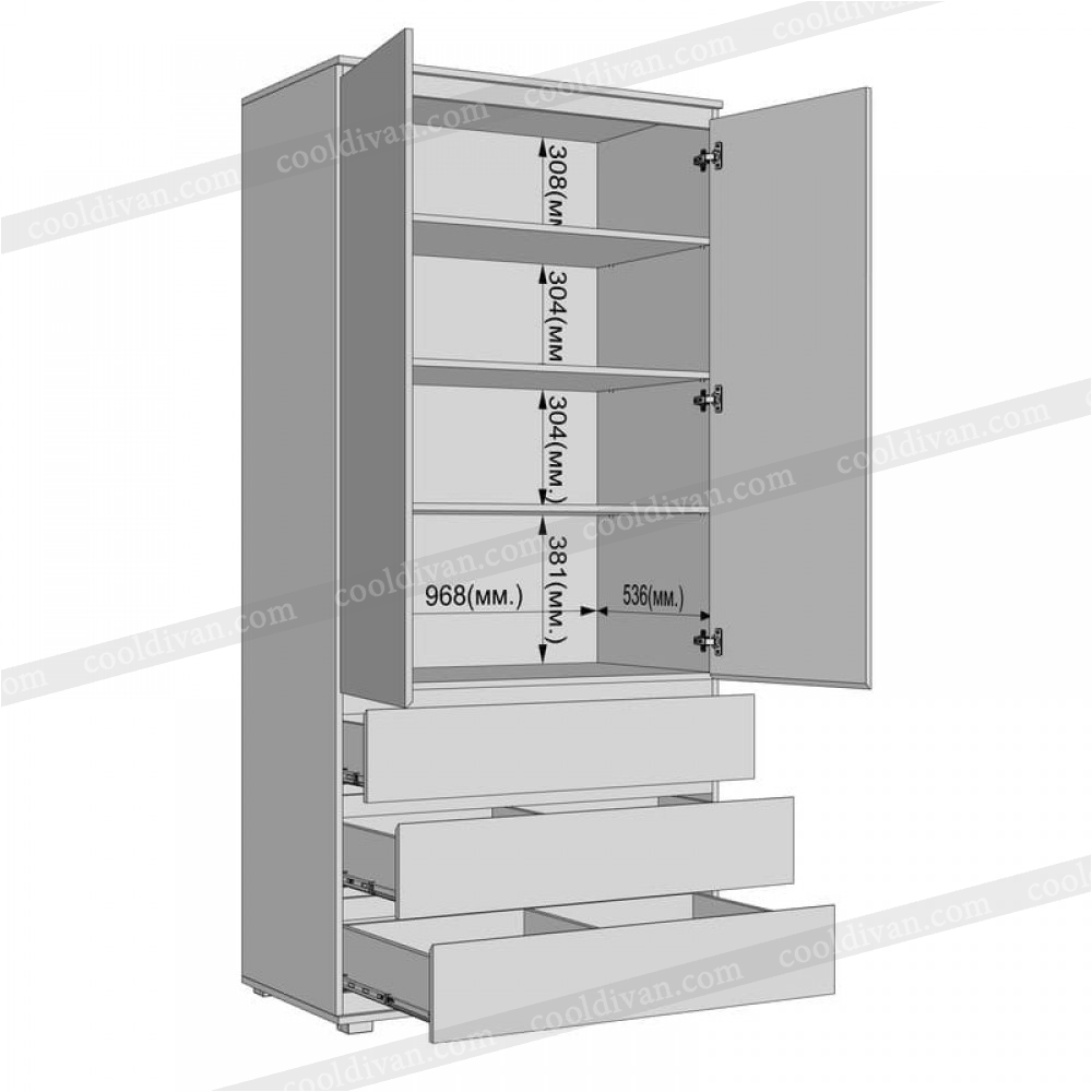 Конструкція включає три полиці для акуратного складання речей та три місткі шухляди на телескопічних направляючих, які забезпечують плавне та надійне відкривання.